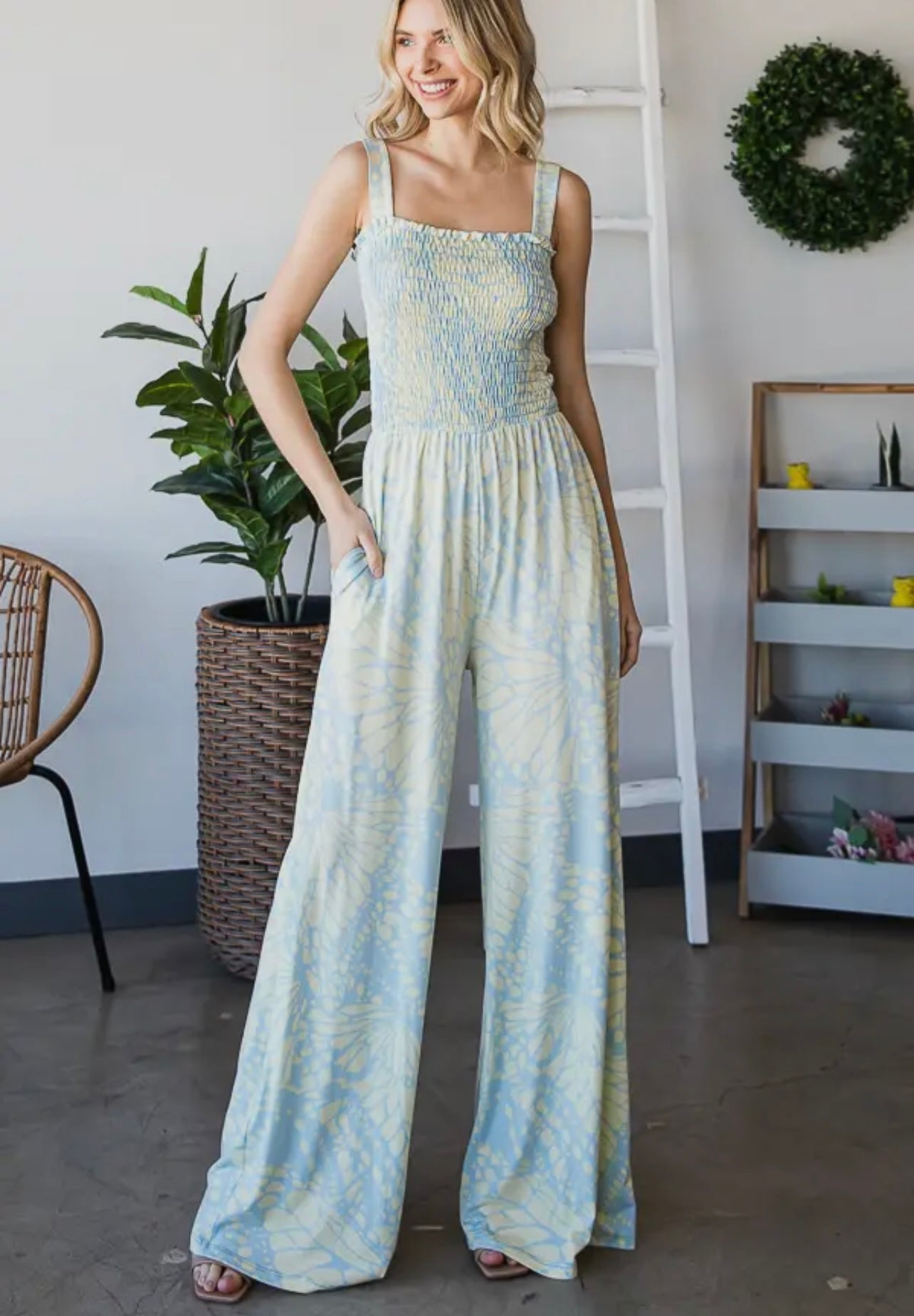 Descriptiom: Knit Cami Jumpsuit featuring smocked top, shirred, and wide leg. Fabric 62% Polyester, 33% Rayon, 5% Spandex