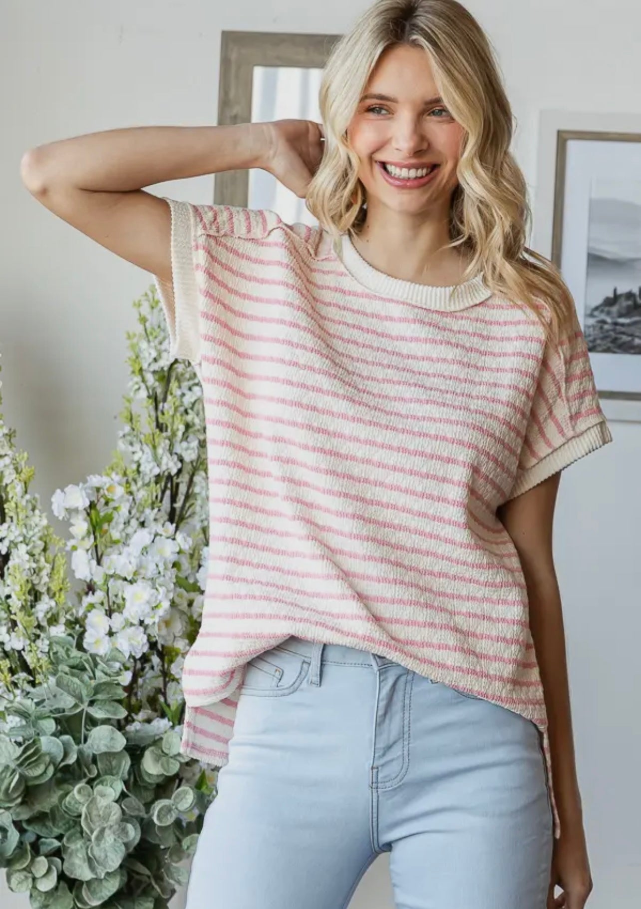 Description:Stripe textured top featuring a round neck, short sleeves, side slit, and a relaxed fit.